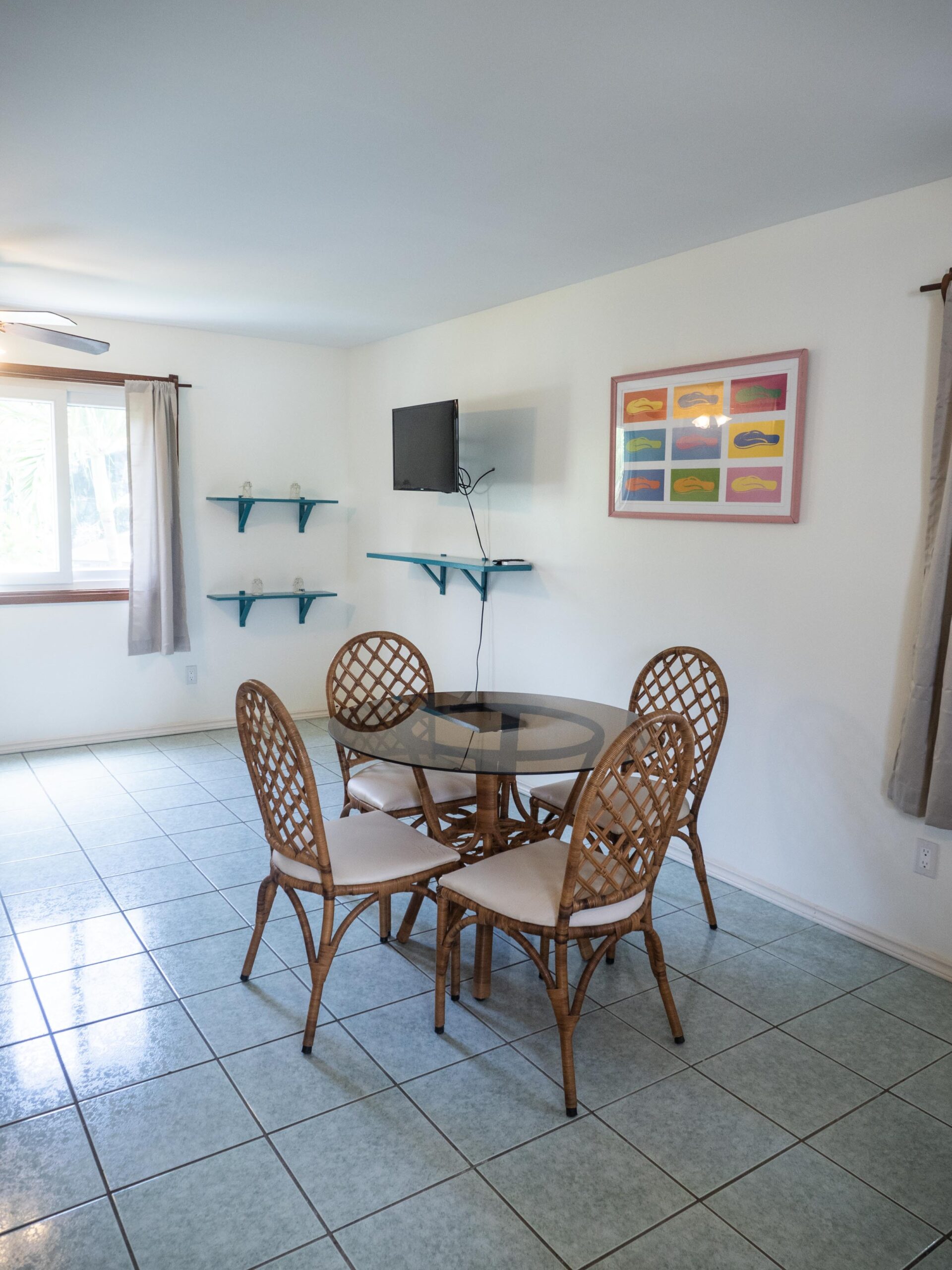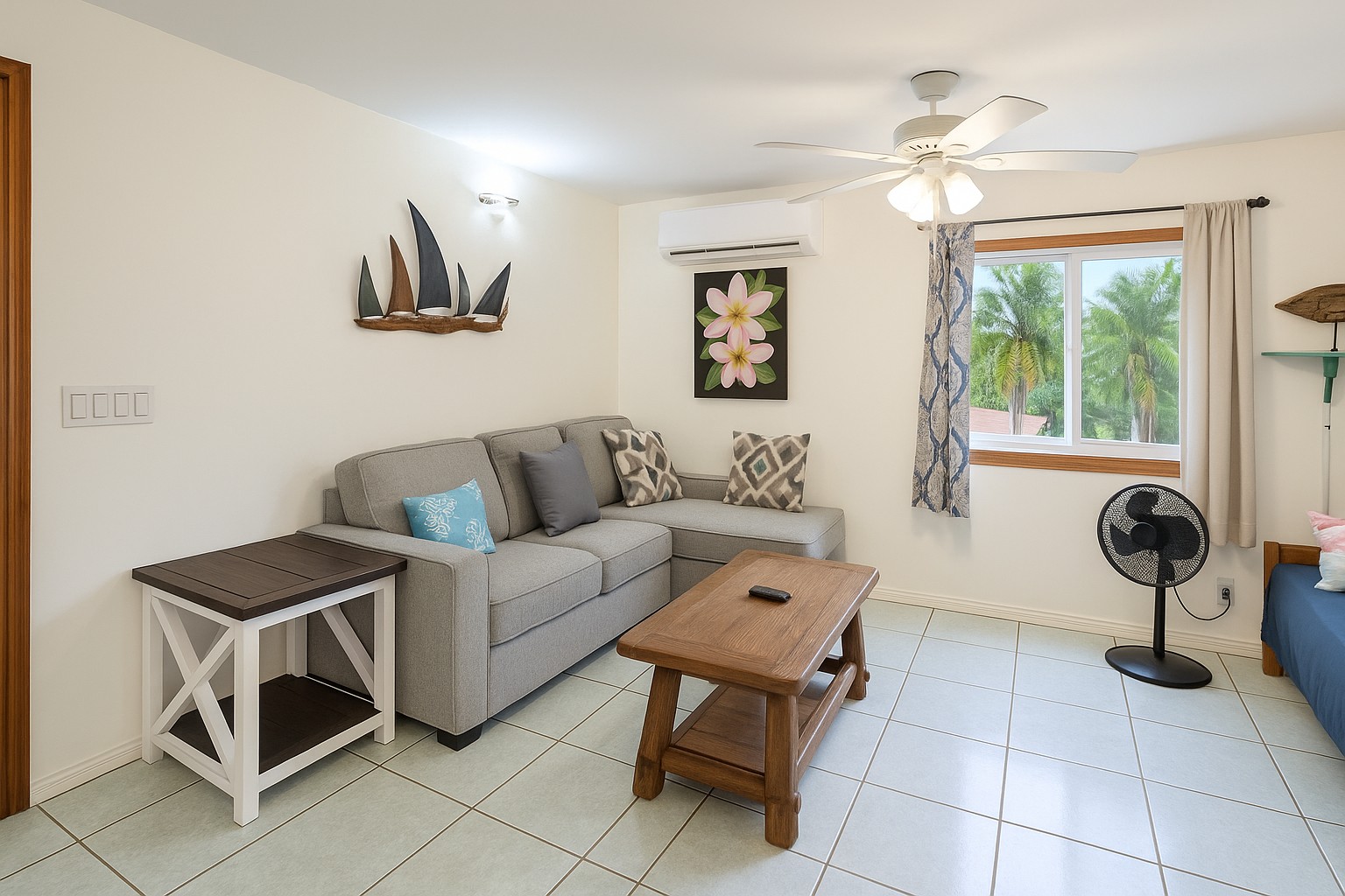 There is a small balcony with outdoor furniture and ocean views. This is the second floor non ocean facing apartment. It has a king bed, a large closet, air conditioning throughout, and ensuite bathroom. We do have a spare twin bed that can be put in the living area. The apartments come with everything you will need whether you are here for a week or a month. There is also a shared washer and dryer and propane BBQ.